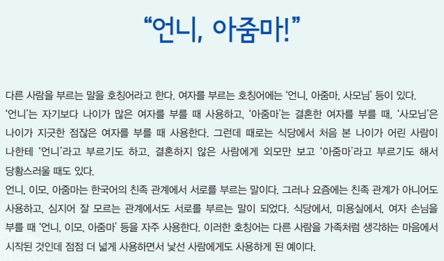 언니, 이모, 아줌마는 한국어의 친족 관계에서 서로를 부르는 말이다. 그러나 요즘에는 친족 관계가 아니어도 사용하고, 심지어 잘 모르는 관계에서도 서로를 부르는 말이 되었다. 식당에서, 미용실에서, 여자 손님을 부를 때 ‘언니, 이모, 아줌마’ 등을 자주 사용한다. 이러한 호칭어는 다른 사람을 가족처럼 생각하는 마음에서 시작된 것인데 점점 더 넓게 사용하면서 낯선 사람에게도 사용하게 된 예이다.