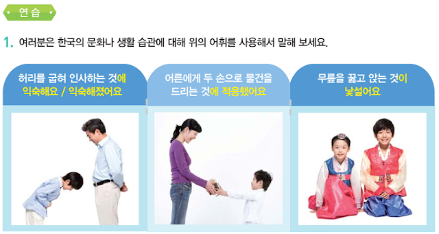 - 허리를 굽혀 인사하는 것에익숙해요 / 익숙해졌어요: Quen/ đã quen thuộc với việc cúi lưng chào hỏi