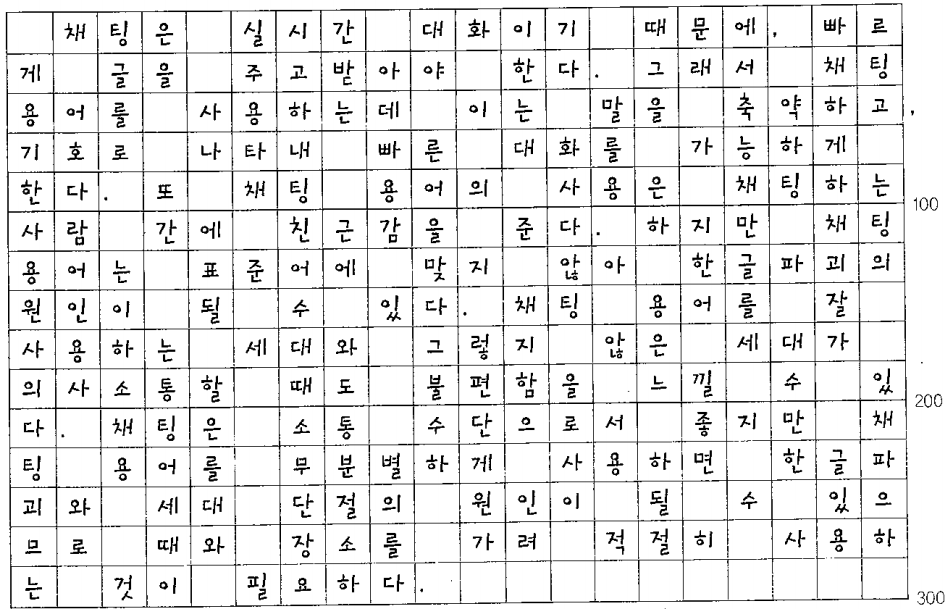 채팅은 실시간 대화이기 때문에, 빠르게 글을 주고받0얘 한다. 그래서 채팅 용어를 사용하는데 이는 말을 축약하고, 기호로 나타내 빠른 대화를 가능하게 한다. 또 채팅 용어의 사용은 채팅하는 사람 간에 친근감을 준다. 하지만 채팅 용 어는 표준어에 맞지 않아 한글파괴의 원인이 될 수 있다. 채팅 용어를 잘 사용하는 세대와 그렇지 않은 세대가 의사소통 할 때도 불편함을 느낄 수 있다. 채팅은 소통 수단으로서 좋지만 채팅 용어를 무분별하게 사용하면 한글파괴와 세대 단 절의 원인이 될 수 있으므로 때와 장소를 가려 적절히 사용하는 것이 필요하다.