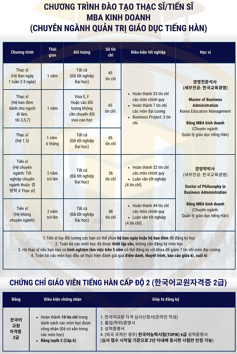 - Thạc sĩ MBA – Quản lý Giáo dục tiếng Hàn (D-2-3): Nhận đồng thời bằng MBA và chứng chỉ giáo viên tiếng Hàn cấp 2 (TOPIK 6). Học 1–1.5 năm.